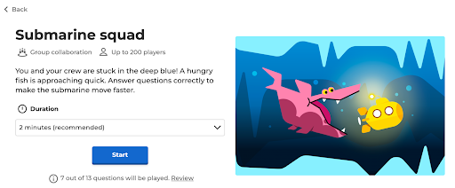 - Submarine Squad, pada game ini pemain akan berkolaborasi sebagai tim awak kapal selam yang menghindarii kejaran ikan paus. Setelah menjawab pertanyaan dengan benar, setiap individu akan memiliki kesempatan untuk menyalakan boost agar kapal selam melaju lebih cepat. Mode game ini juga melatih kolaborasi karena akan ada momen di mana instruktur atau kapten kapal memberi aba-aba awak untuk menyelam dengan menekan tombol pada layar piranti sesuai dengan instruksi sang kapten. Game ini sangat cocok untuk review materi pelajaran dan meningkatkan kolaborasi siswa. Format: Pemain vs Komputer.